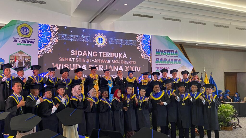Gresikbersatu Mojokerto, 14 September 2025 – Sekolah Tinggi Ilmu Ekonomi (STIE) Al-Anwar Mojokerto menggelar Sidang Terbuka Senat dalam rangka Wisuda Sarjana XXIV di Ballroom Ayola Sunrise Mall Mojokerto, Minggu (14/9). Acara berlangsung khidmat dengan dihadiri ratusan wisudawan beserta keluarga, jajaran pimpinan kampus, serta tamu undangan, termasuk Bupati Mojokerto, Dr. H. Muhammad Al Barra, Lc., M.Hum.