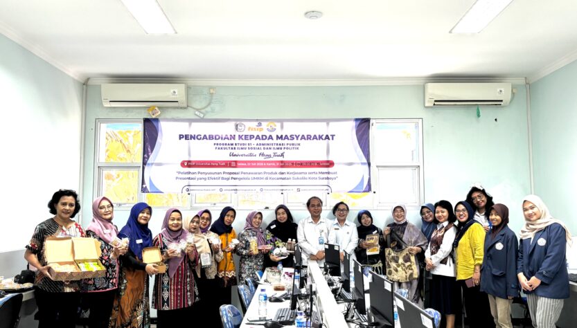 Surabaya, 30 Juli 2025 – Sebagai wujud komitmen dalam penguatan kapasitas pelaku usaha mikro di daerah perkotaan, Program Studi S-1 Administrasi Publik Fakultas Ilmu Sosial dan Ilmu Politik Universitas Hang Tuah (FISIP UHT) menggelar kegiatan Pengabdian Masyarakat (Penmas) bertajuk “Pelatihan Penyusunan Proposal Penawaran Produk dan Surat Penawaran bagi UMKM” di Kecamatan Sukolilo, Kota Surabaya, pada Rabu, 30 Juli 2025.
