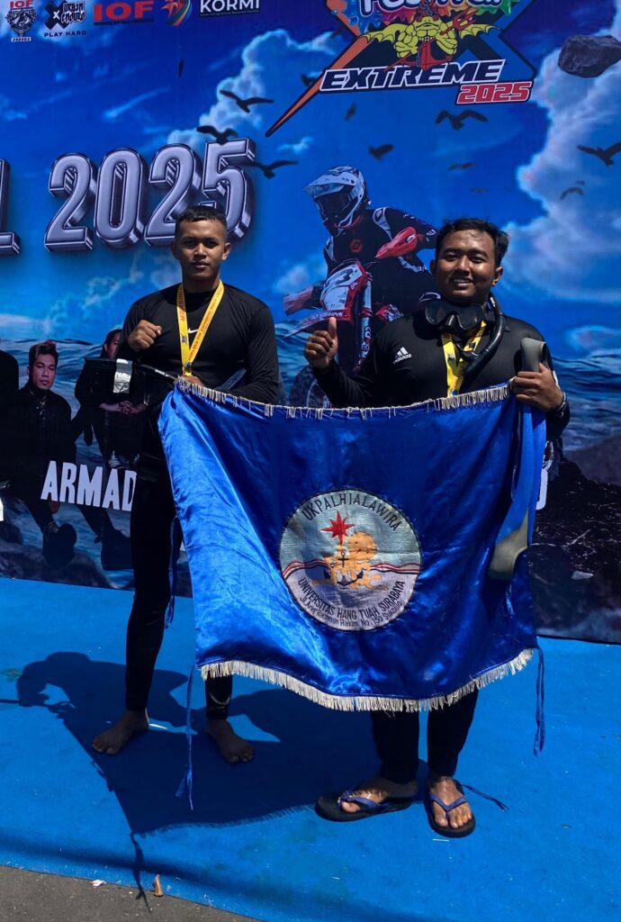 Di antara 850 perenang tangguh yang ikut serta, dua mahasiswa Universitas Hang Tuah (UHT) dari UKM Jalawira turut ambil bagian, yaitu Wisnu Samudera (20230810068) dan Reyhan Fahrel Novaltian (20230610030). Dengan semangat juang tinggi, keduanya berhasil menuntaskan lintasan penuh dan berhak meraih medali finisher.