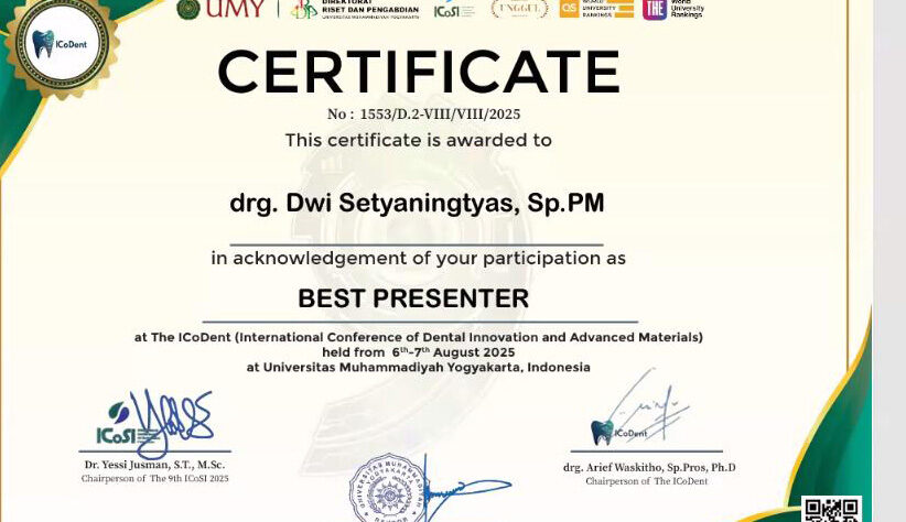 Dosen FKG UHT, drg. Dwi Setyaningtyas, Sp.PM, tercatat meraih penghargaan Best Presenter dalam dalam ajang 1st ICoDent 2025 (International Conference of Dental Innovation and Advanced Materials) yang menjadi bagian dari rangkaian besar acara The 9th International Conference On Sustainable Innovation (ICoSI) dan The 3rd International Conference of Community Service (ICCS) yang diselenggarakan oleh FKG Universitas Muhammadiyah Yogyakarta (UMY) pada tanggal 6–7 Agustus 2025.